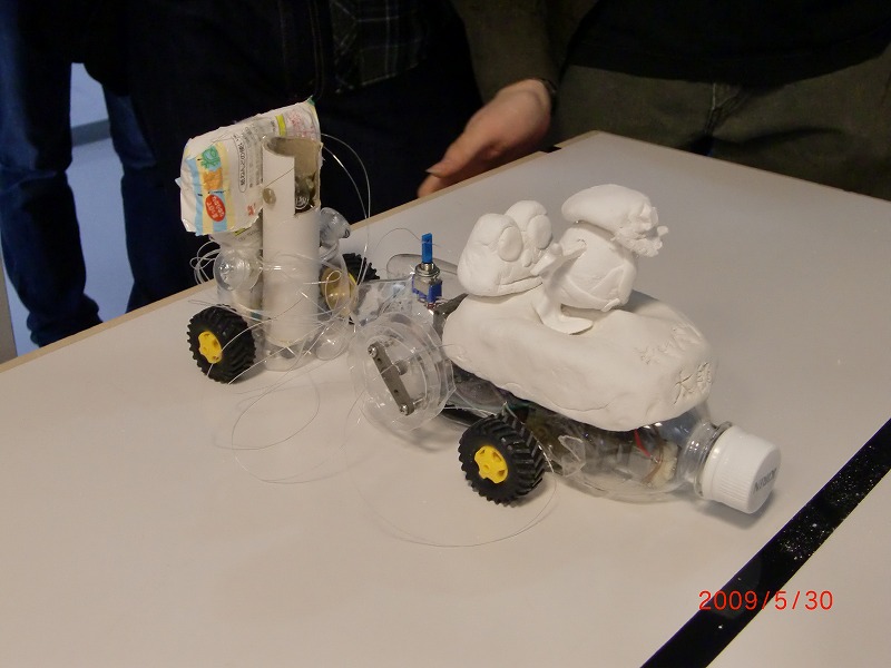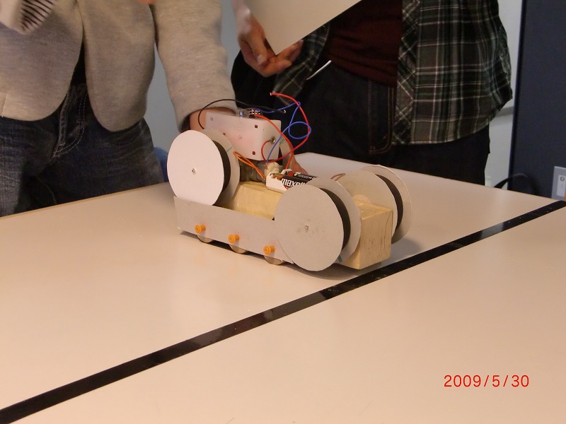 今日、というかあっという間に日付が変わって昨日、カーリングロボット大会を開催しました。 色々おもしろい機体が続出して個人的には成功だったんじゃないかと思います。 ちなみに優勝記録は誤差0.90mm。2位の記録は2.10mm(2年機「ヨーゼフ」)でした。 こいつは糸を巻き取って後輪をギヤボックスごと浮かせて機体が尻餅をつく形で止まります。なかなかユニークです。 他にも、こんなの↓がいました。 てかこのアイディア自体出てたアイディアを自分がアドバイスしてやらせてしまった感がありました。てかやってくれたことに感激。これで1年機の中では2位という。。。すばらしい。 そして、他の1年生の機体を紹介。 右「小張」(ちょうさん) 他の機体も紹介したいところですが、大人の事情により割愛。 総則として、今回は糸を使った「巻き取り式」多数でした。欲を言えばもうちょっと基本コンセプトの違う機体があったらよかったと。といっても、ここまで多様な作りだったのは1年生の努力の賜物です。ほんとかわさきが楽しみだ。 そして今後は。。。 ・CAD講習会を再開する。 ・かわさきの武装を1年生には考えてもらう。 ・2/3年生は機体を製作する。 これを軸に夏までがんばると思います。 それではこの辺で。稲葉 |